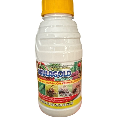 AKULAGOLD 260EW chứa 3 hoạt chất ( Profenofos, Thiamethoxam và Beta – Cypermethrin) có khả năng phòng trừ các loại sâu hại như: rầy xanh, rầy phấn trắng, rầy chổng cánh, bọ trĩ, bọ xít, rệp sáp, rệp muội, sâu đục quả, ruồi vàng, sâu đất, nhện đỏ,….. trên cam, quýt, bưởi, sầu riêng,...